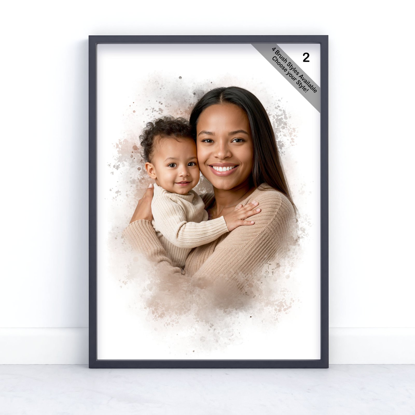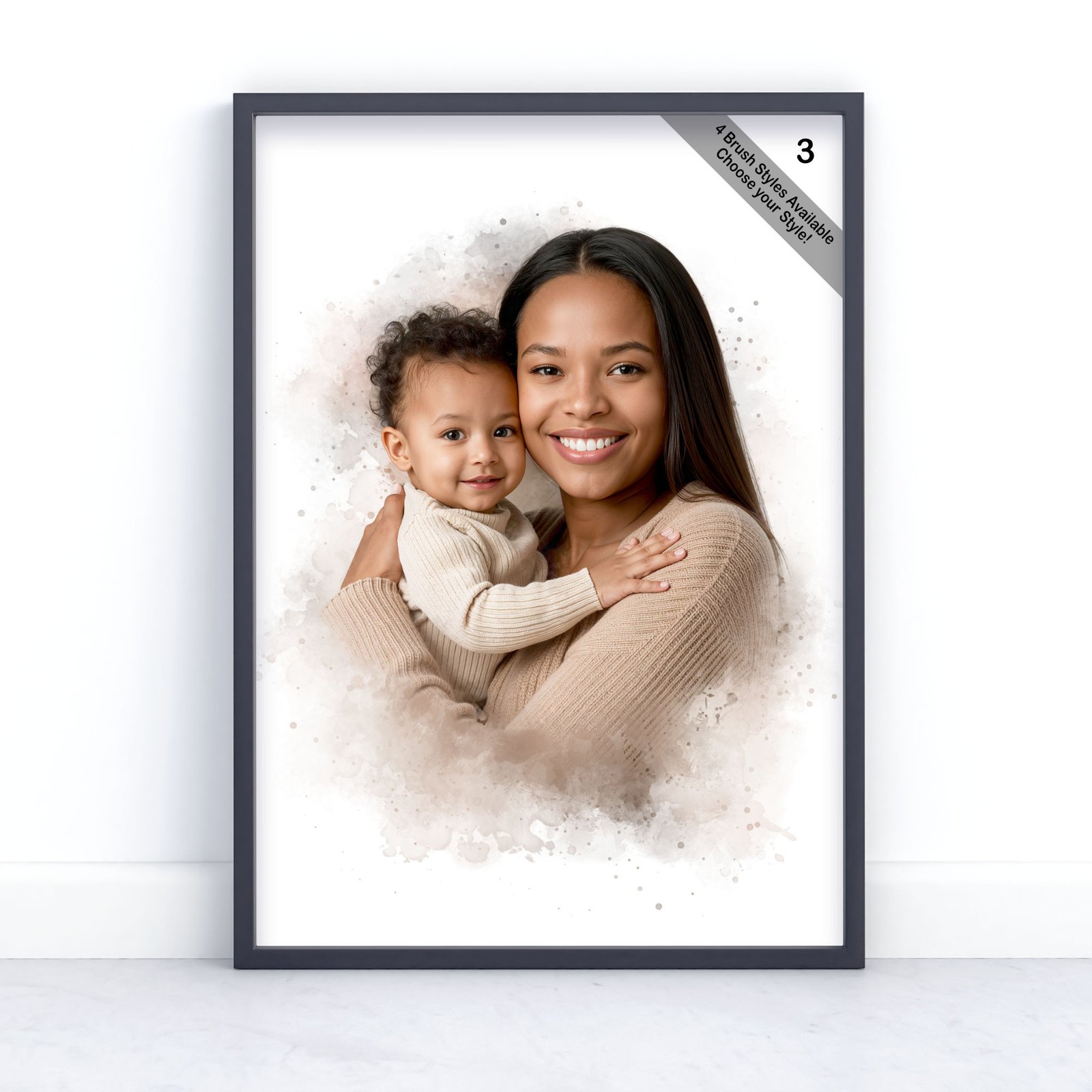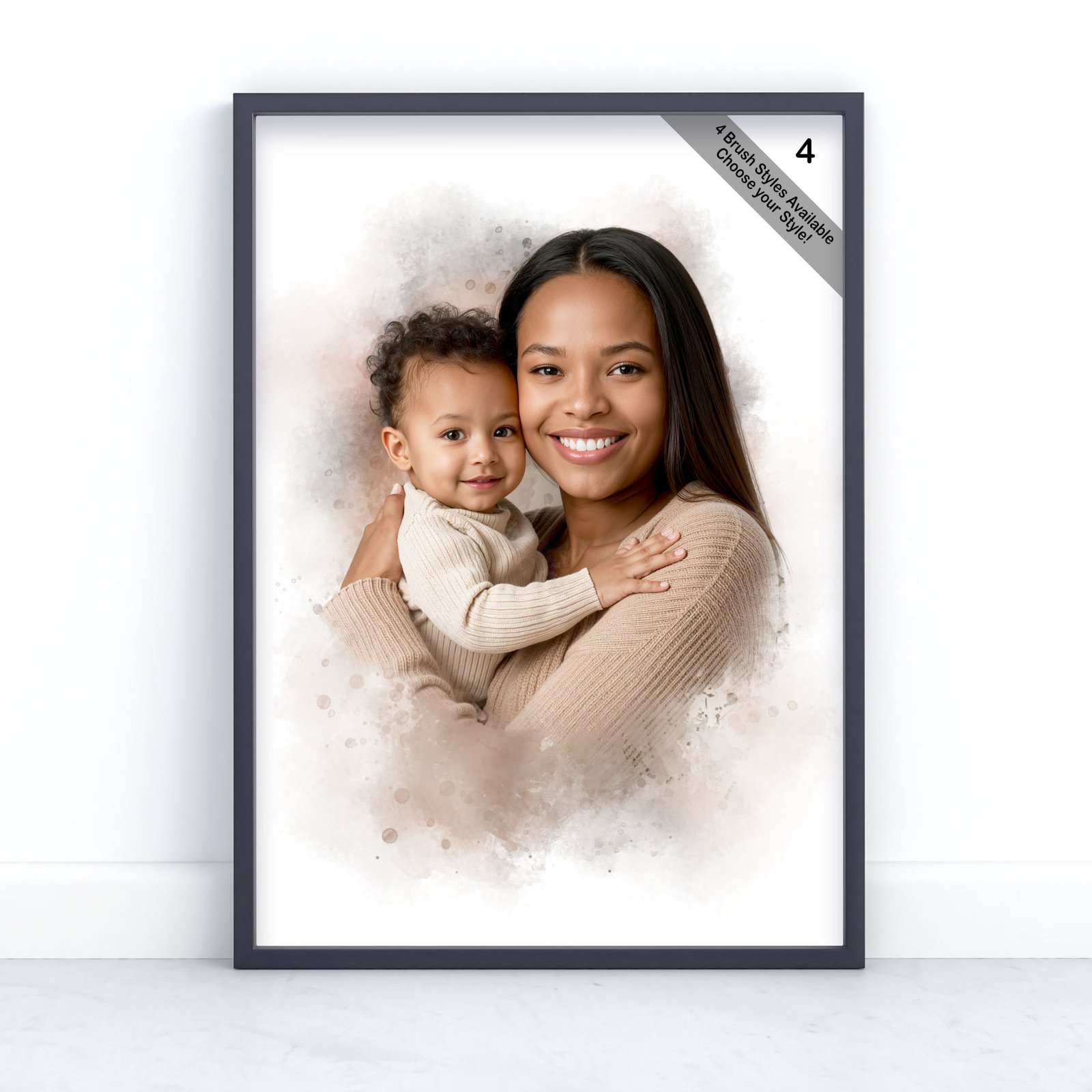 Each portrait is carefully created in a soft digital watercolour style, transforming your cherished memories into timeless wall art — perfect for gifts or your own home.